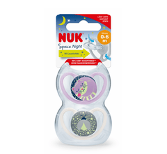 NUK Space Night Soothers ndihmojnë foshnjat të gjejnë rrugën e tyre me lehtësi për në Tokën e Ëndrrave. Falë një materiali ndriçues të sigurt për foshnjat, qetësuesit rrezatojnë një shkëlqim të butë në errësirë dhe mund të gjenden shpejt dhe lehtë edhe gjatë natës.